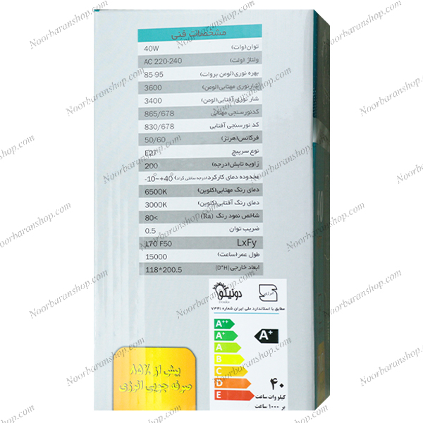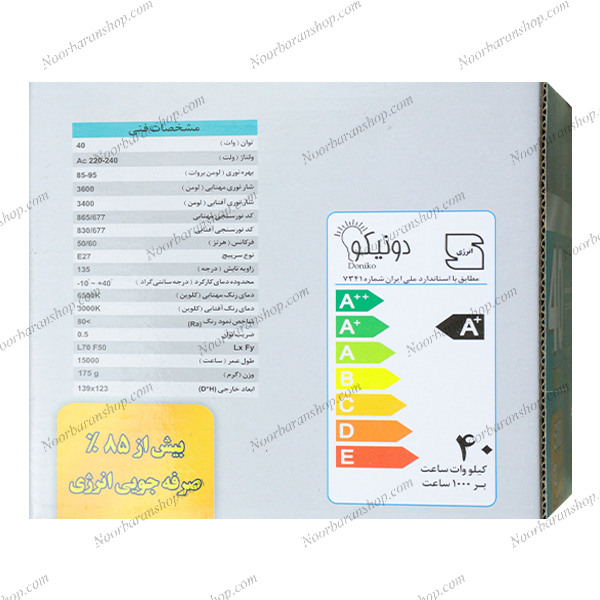 لامپ کم مصرف ال ای دی 40 وات دونیکو دارای پایهی استاندارد E27 است که باعث میشود بهراحتی در اکثر پریزها و سوکتهای روشنایی قابل نصب باشد.لامپ ال ای دی 40 وات دونیکوبا راندمان نوری بالا، شار نوری بسیار زیاد و عمر طولانی ، انتخاب مناسبی برای مکان هایی است که تعویض لامپ مشکلات و هزینه فراوانی به دنبال دارد. این لامپ به دلیل داشتن نوری دلنشین و زیبا برای استفاده در فضا های بسته , باز همچون منازل ، دفاتر ، فروشگاه ها ، چراغ های صنعتی و … ، قابل استفاده است. لامپ ال ای دی 40 وات دونیکو با سرپیچ E27 عرضه می شود. دارای شار نوری 3400 لومن برای رنگ آفتابی و 3600 لومن برای رنگ مهتابی است.هر چه دمای رنگ لامپ بالاتر باشد، نور آن سردتر و طبیعی تر است. یک شمع در دمای رنگ 1500 کلوین میدرخشد. رنگ نور لامپهای رشتهای در حدود 4500 کلوین است. لامپ های ال ای دی که به عنوان جایگزینهای رشتهای به بازار عرضه می شوند، معمولا دمای رنگی 6500 کلوین دارند که رنگ سفید گرمی را ارائه می کند.